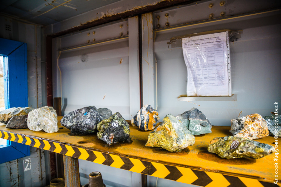 Среди 12 образцов руд золотосодержащие (конглобрекчия, березитированный алевролит), вскрышные (конглобрекчия, берекчированный известняк, алевролит) и комплексные породы (порфирит, силикатный скарн, магнетированный скарн). Тоже прочитал по специальному листику, ибо ничего в этом не понимаю.