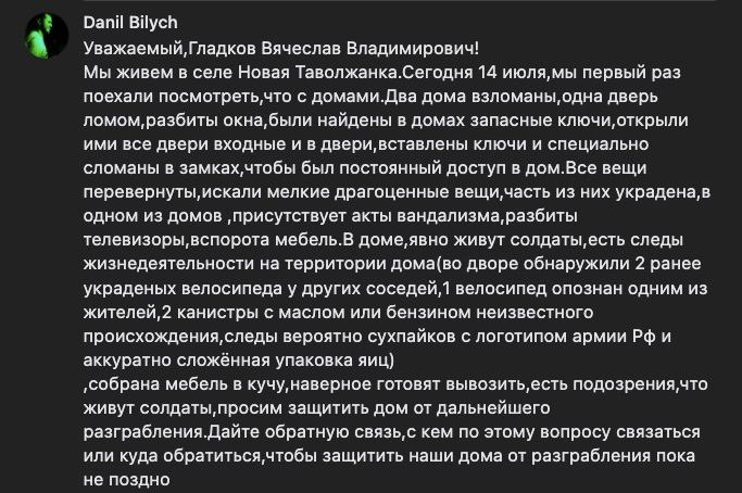 Днем ранее другой житель Новой Таволжанки оставил на странице Гладкова похожий комментарий, убедился «Холод». По его словам, двери нескольких домов взломали.