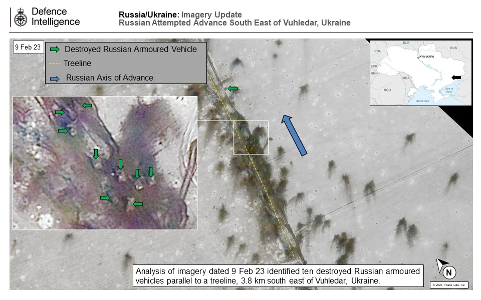 Позже британская разведка, а также Институт изучения войны сообщали, что под Угледаром в Донецкой области понесла «чрезвычайно большие» потери российская 155 бригада морской пехоты. Ссылаясь на спутниковые снимки, эксперты указали на потери российской техники и заявили, что уничтоженные боевые машины входили в состав элитной бригады морпехов.