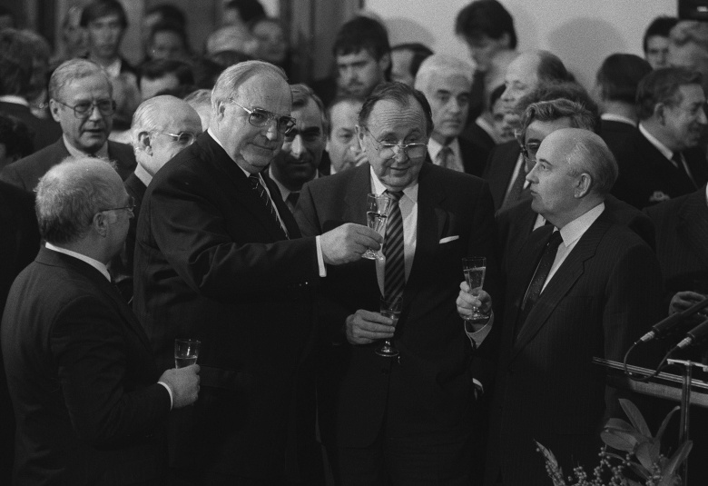 «Михаэль, почему вы такой грустный?» Канцлер ФРГ Гельмут Коль, министр иностранных дел Германии Ганс-Дитрих Геншер и советский лидер Михаил Горбачев (в центре слева направо) обмывают Договор об окончательном урегулировании в отношении Германии. Москва, 12.09.1990.