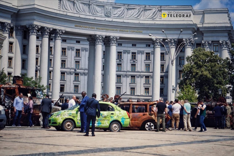 Делегация ЮАР во главе с Сирилом Рамафосой осматривает уничтоженную российскую технику на Михайловской площади в Киеве, 16 июня 2023 года