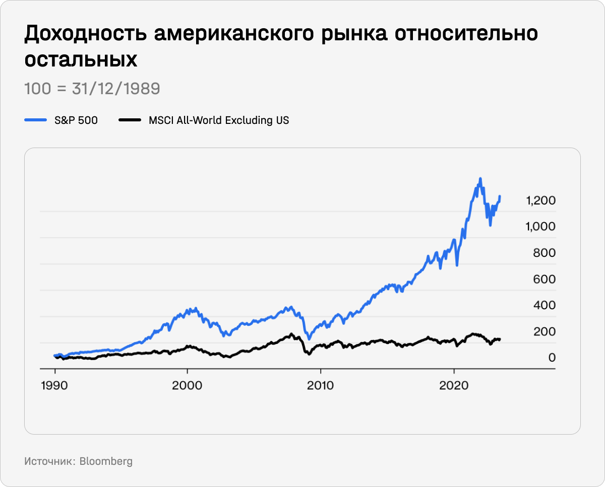 Некоторые выдающиеся инвесторы, в том числе Уоррен Баффетт и Джон Богл, тоже доказывали, что рынок США — лучший выбор для инвесторов: во-первых, из-за особенностей США, которые делают страну привлекательной для инвестиций (институты, законы и т. д.), во-вторых, — из-за того, что американский бизнес имеет большое международное присутствие. По данным Goldman Sachs на 2022 год, около 30% выручки компаний из S&P 500 приходится на страны за пределами США (для сравнения, у развивающихся рынков, по последним данным Morningstar, этот показатель составляет 10%). Таким образом, вкладываясь в компании в США, инвестор фактически инвестировал и за ее пределами.