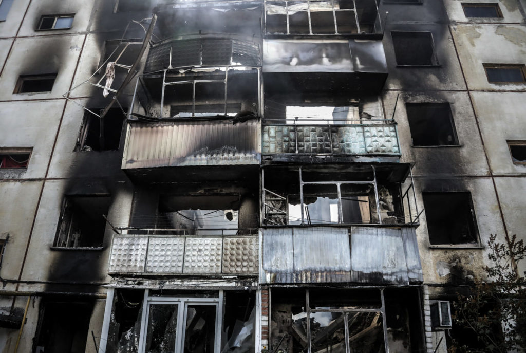 В соседнем дворе тоже горит дом. Ночью в него попала ракета, средние этажи провалились внутрь. На ветках висят детские игрушки, словно это выкинутые люди. Вдруг во двор заезжает машина с дырками в стекле и из неё выпрыгивают две женщины: мать и дочь. Секунду они смотрят на тлеющий бетон — и тут же бросаются наверх, чтобы спасти вещи.