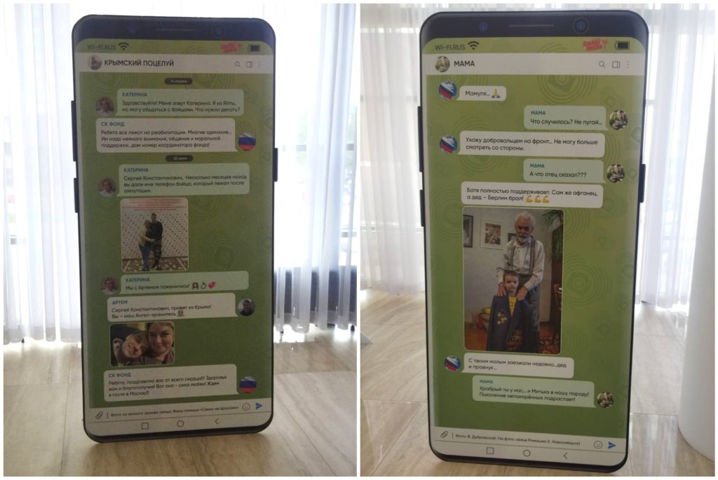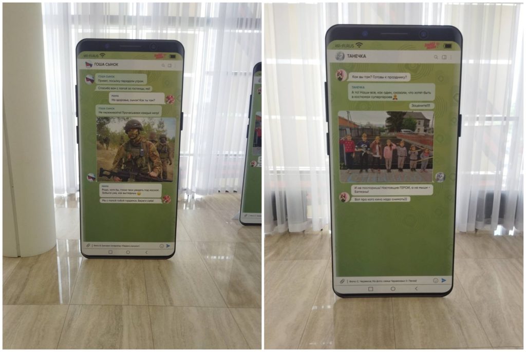 На другом стенде — переписка дочери и матери. Дочь, судя по чату, тоже занимается доставкой гуманитарной помощи на территорию Украины. В чате мать беспокоится о том, чтобы дочь «была аккуратнее», и хвалит её за то, что «всё довезли деткам в целости и сохранности». Дочь присылает фотографии: сначала снимок вместе с другими участниками «гуманитарной поездки» на фоне грузовика и коробок, а затем — селфи в каске.