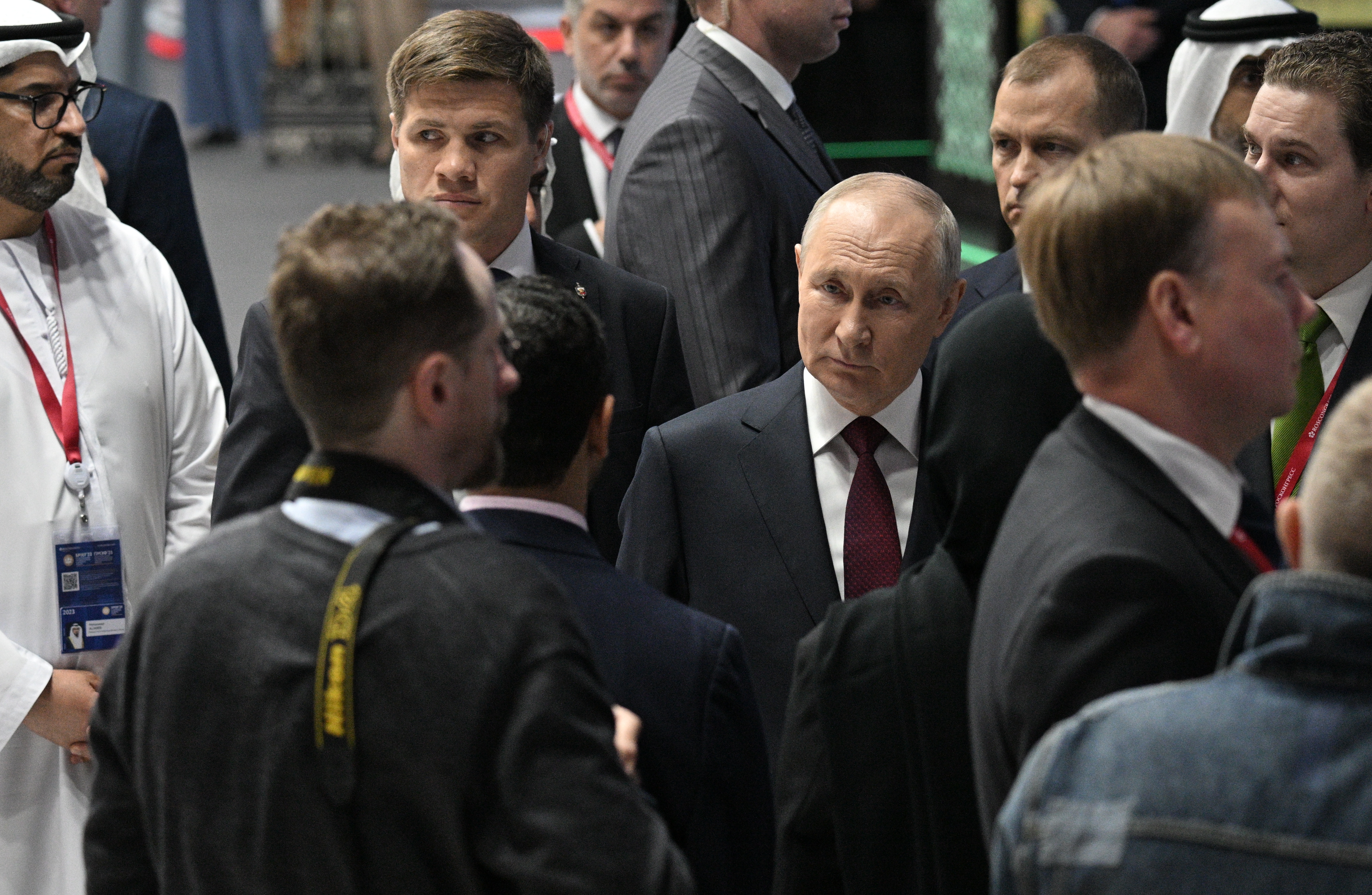 Владимир Путин и президент ОАЭ Мухаммад ибн Заид аль-Нахайян обходят павильоны ПМЭФ, 16 июня 2023 г.