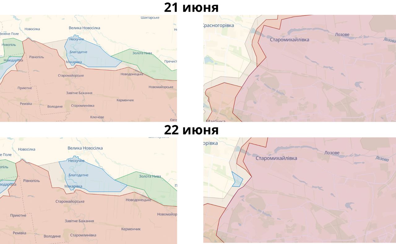 ВСУ к утру пятницы смогли продвинуться на двух участках фронта в Донецкой области. В общей сложности под контроль ВСУ с 21 июня перешло 1,64 кв км территории.
