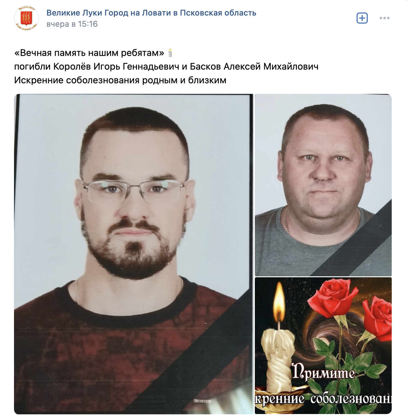 Как сообщает паблик в соцсети «ВКонтакте» «Великие Луки город на Ловати», погибли Игорь Королёв и Алексей Басков.