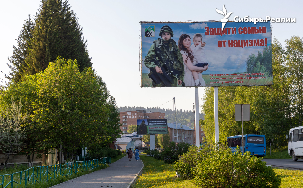 На кемеровских улицах практически не видно упоминаний о войне. Есть только наружная реклама с цитатами Путина и машины муниципального автопарка с надписями "Своих не бросаем". Фотографии погибших на билбордах тоже отсутствуют. Тогда как в Таштаголе (около 350 км от областного центра) буквально каждые 10 метров стоят рекламные щиты с изображениями в том числе кемеровских СОБРовцев, погибших в Украине.