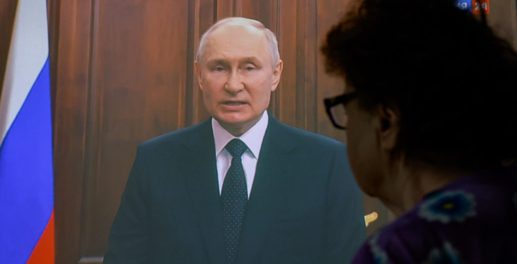 Женщина смотрит экстренное обращение Путина утром 24 июня.