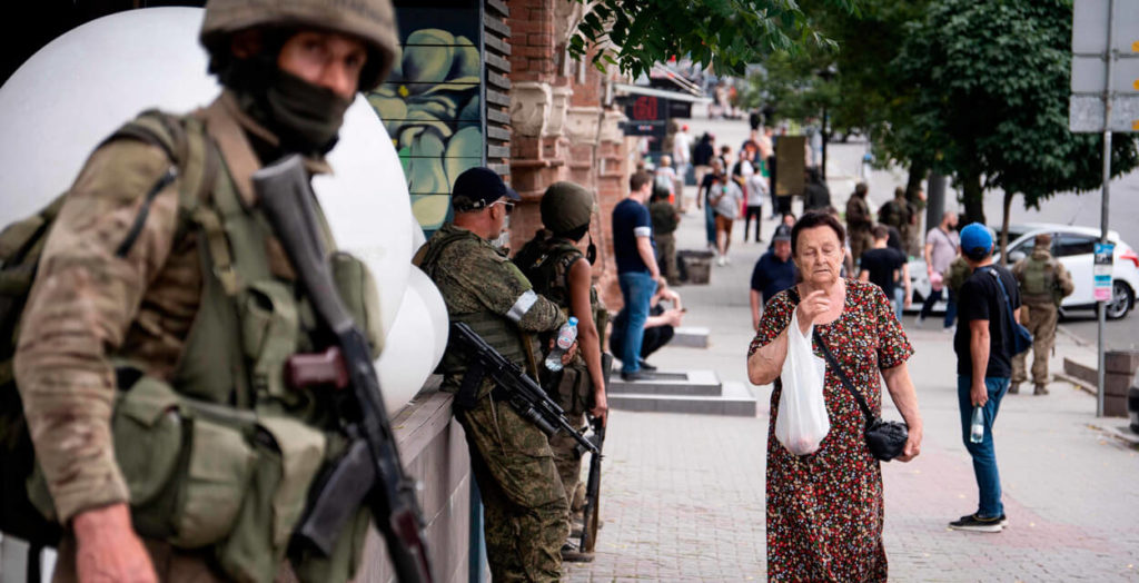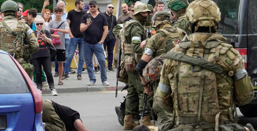 Военные ЧВК задерживают местных на улице в Ростове-на-Дону.