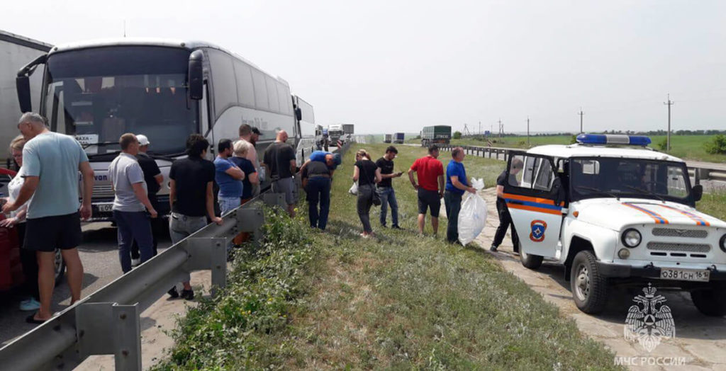 Сотрудники МЧС помогают застрявшим на трассе М4-Дон пассажирам автобусов.