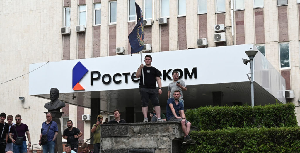 Сторонник ЧВК Вагнера держит флаг у офиса Ростелекома возле штаба Южного военного округа в Ростове-на-Дону.