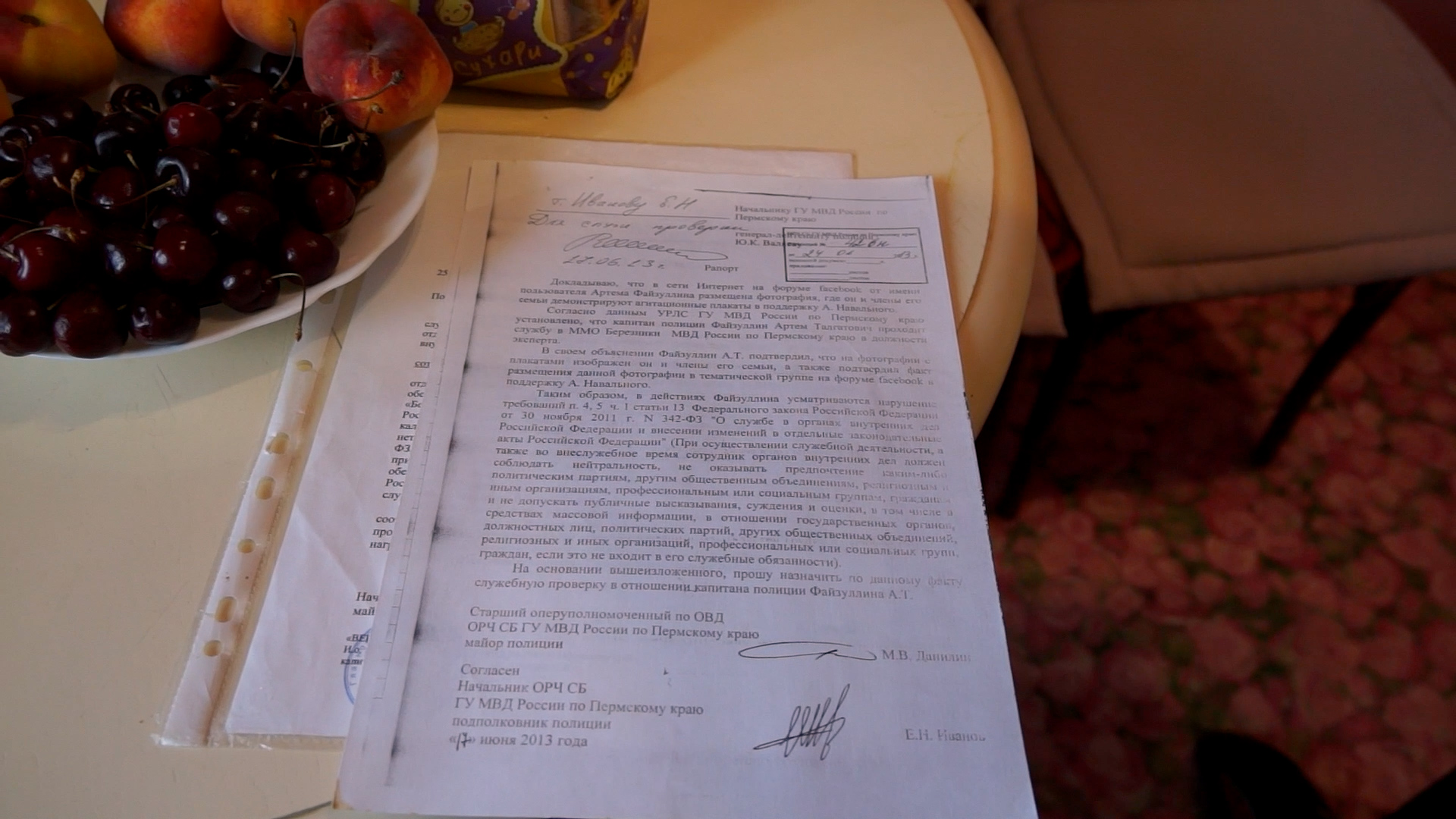 "В сети интернет на форуме "Фейсбук"… размещена фотография, где он и члены его семьи демонстрируют агитационные плакаты в поддержку Навального". Заключение о служебной проверке: "[Уволен] в связи с совершением поступка, порочащего честь сотрудника органов внутренних дел".
