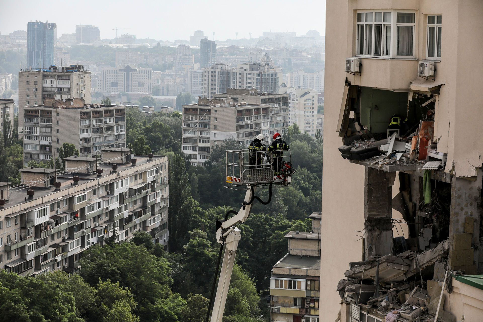 В ночь на 24 июня Россия атаковала Киев крылатыми ракетами Х-101/Х-555 — более 20 ракет, по сообщению Киевской военной администрации, удалось сбить силам ПВО. В Соломенском районе города обломки ракеты попали в 25-этажный жилой дом, произошло разрушение и возгорание нескольких этажей здания. Пожар удалось затушить к утру. По данным местной военной администрации, в результате атаки пострадали 11 человек, четверо из них госпитализированы. Еще трое погибли.