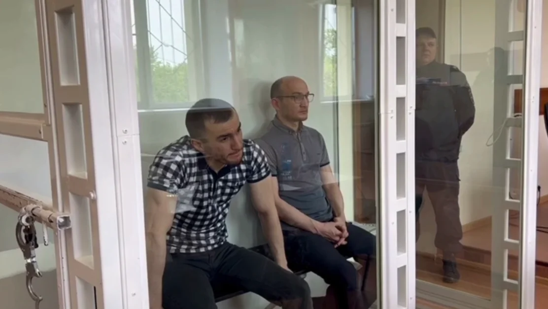Бывшие сотрудники полиции и прокуратуры Алихан и Бекхан Аслахановы (слева направо) в зале суда. Скриншот видео прокуратуры Красноярского края