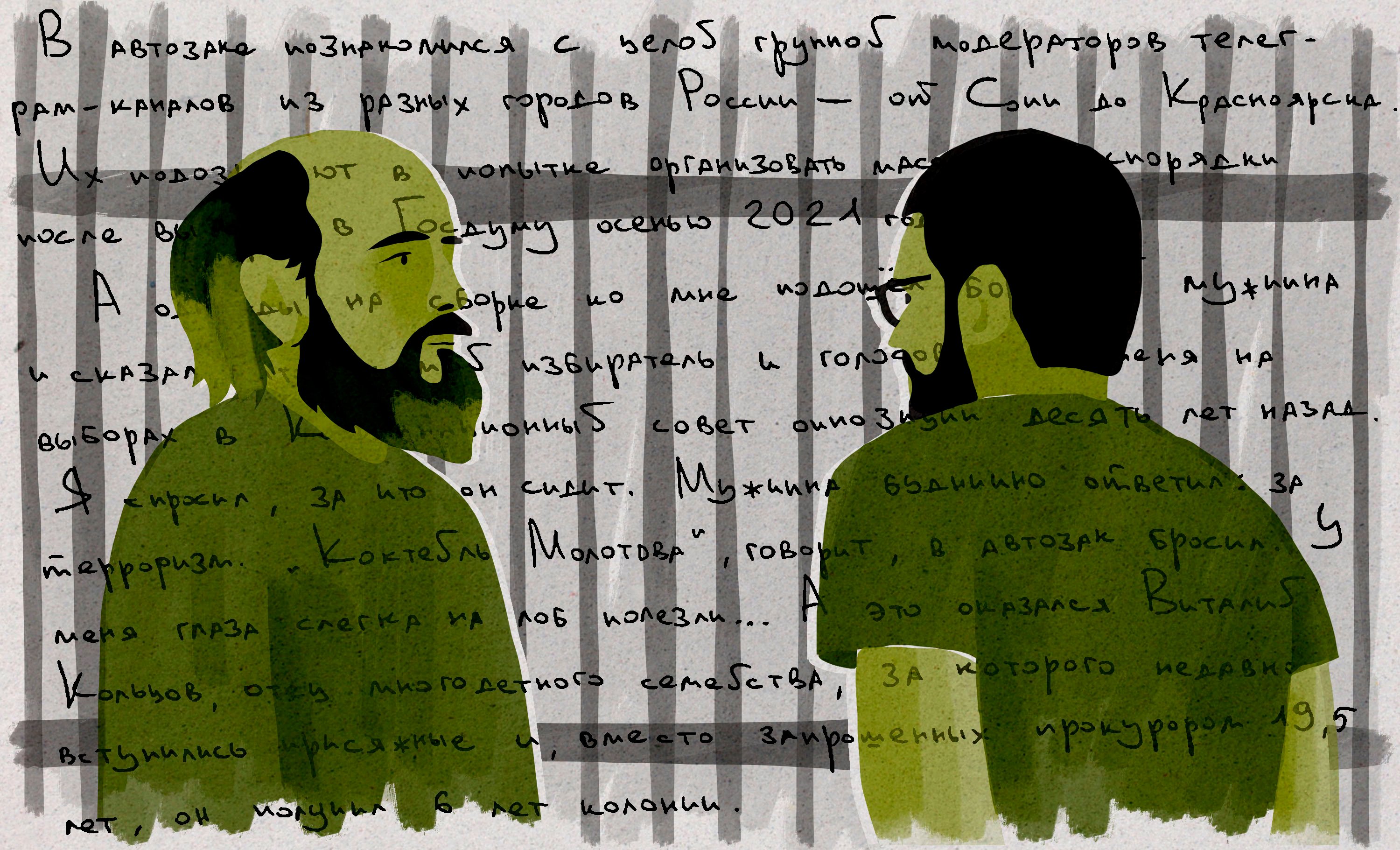 В автозаке познакомился с целой группой модераторов телеграм-каналов из разных городов России, от Сочи до Красноярска. Их подозревают в попытке организовать массовые беспорядки после выборов в Госдуму осенью 2021 года.