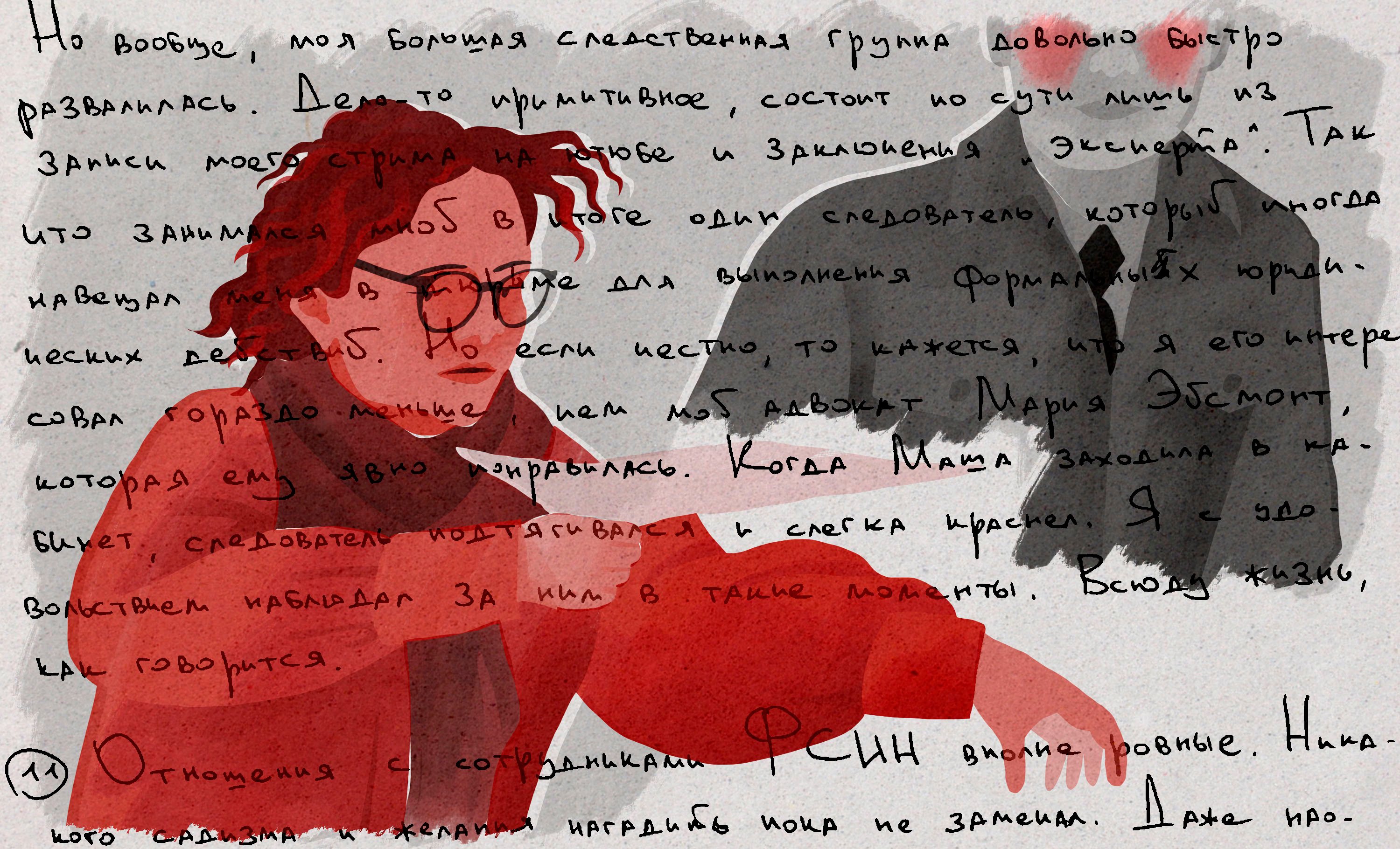 Но вообще, моя большая следственная группа довольно быстро развалилась. Дело-то примитивное, состоит, по сути, лишь из записи моего стрима на ютюбе и заключения «эксперта». Так что занимался мной в итоге один следователь, который иногда навещал меня в тюрьме для выполнения формальных юридических действий. Но если честно, то кажется, что я его интересовал гораздо меньше, чем мой адвокат Мария Эйсмонт, которая ему явно понравилась. Когда Маша заходила в кабинет, следователь подтягивался и слегка краснел. Я с удовольствием наблюдал за ним в такие моменты. Всюду жизнь, как говорится.