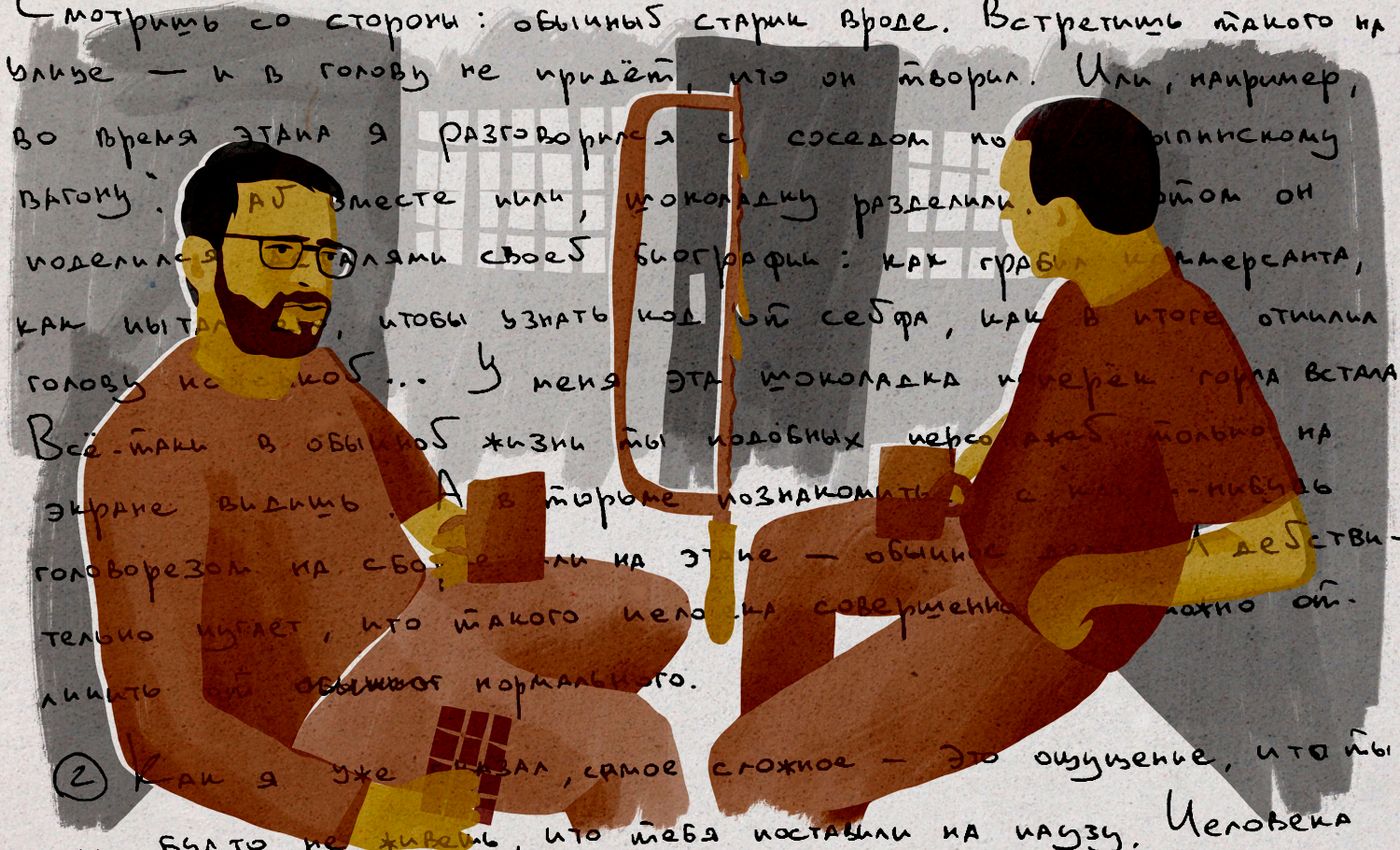 Еще сложно привыкнуть к тому, что за решеткой периодически встречаешься лицом к лицу с откровенным, концентрированным злом. На той же сборке я видел, как к компании зэков подошел дряблый старичок и попросил сигарету. Все просто молча отошли в сторону, ни один не проронил ни слова. Я спросил: «Что не так с этим дедом?». Оказалось, детей насиловал, и даже сюжет в новостях про него показывали. Смотришь со стороны: обычный старик вроде. Встретишь такого на улице — и в голову не придет, что он творил. Или, например, во время этапа я разговорился с соседом по столыпинскому вагону. Чай вместе пили, шоколадку разделили. А потом он поделился деталями своей биографии: как грабил коммерсанта, как пытал его, чтобы узнать код от сейфа, как в итоге отпилил голову ножовкой… У меня эта шоколадка поперек горла встала. Все-таки в обычной жизни ты подобных персонажей только на экране видишь. А в тюрьме познакомиться с каким-нибудь головорезом на сборке или на этапе — обычное дело. И действительно пугает, что такого человека совершенно невозможно отличить от нормального.