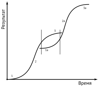 В науке возникновение и развитие нового подчиняется, вообще говоря, такой же зависимости. Когда возникает некая качественно новая научная или техническая идея, то в первое время она не находит большого числа сторонников (или вообще испытывает противодействие); развитие нового научного направления или новой технической системы происходит медленно (1 — нижняя пологая часть кривой). Но постепенно «идея овладевает массами», научные и технические новинки расходятся быстрее (часть 2 кривой). Однако в конце концов наступает насыщение, кривая выходит на плато (часть 3), возникает потребность в очередной качественно новой идее. И такая идея рано или поздно появляется, возникает новая S-образная кривая.