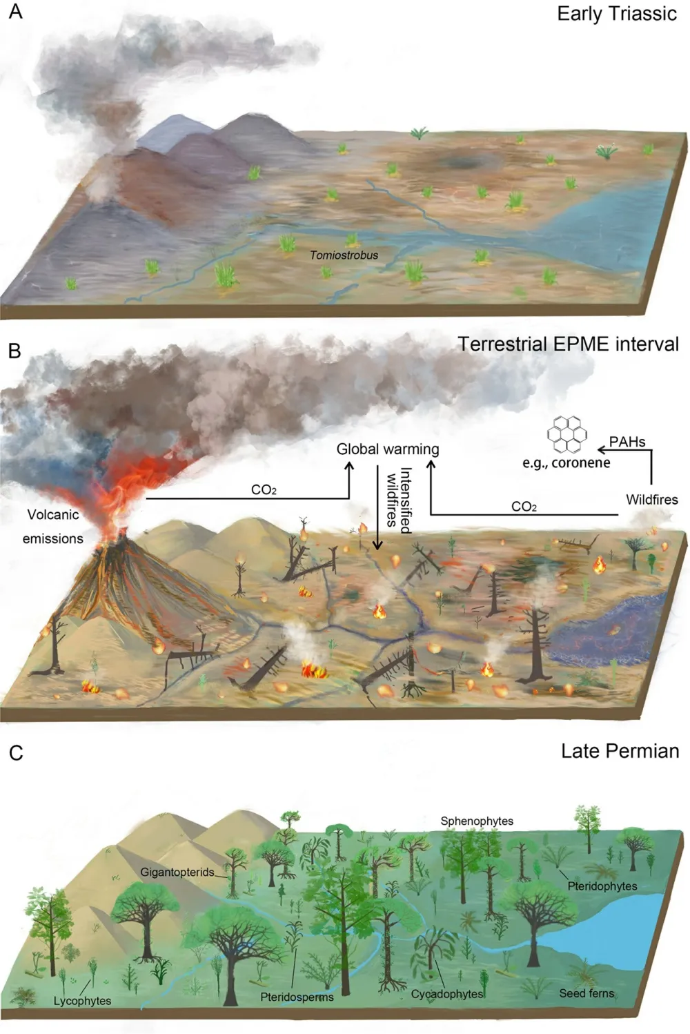 В нижнем триасе ПАУ становится меньше. Это указывает на нехватку «топлива» для пожаров после исчезновения тропических лесов, сменившихся травянистой экосистемой, напоминающей вересковую пустошь.