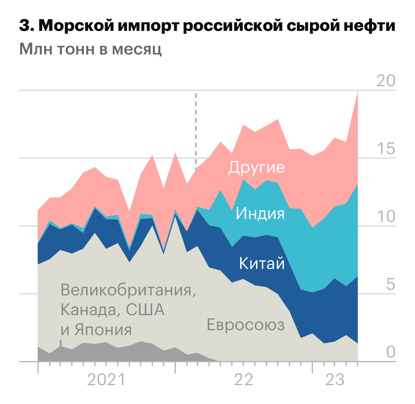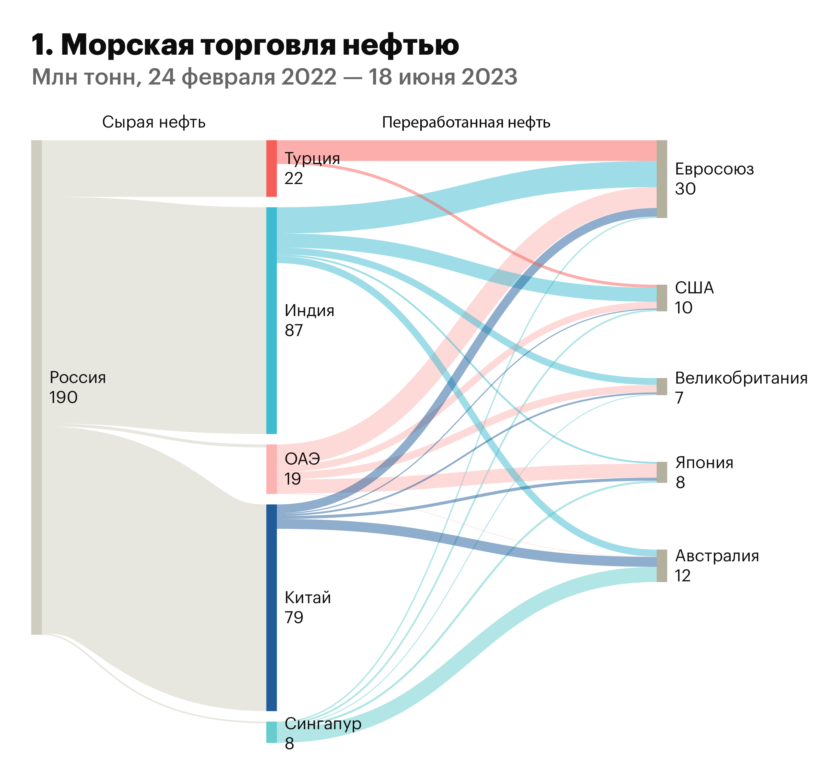 На первый взгляд все эти меры привели к полной перестройке довоенных торговых путей: на место Евросоюза и стран «Семерки» в морской нефтяной торговле с Россией пришли Китай и Индия. Но, согласно недавнему докладу Центра по изучению энергетики и чистого воздуха, изменения оказались не такими уж существенными, поскольку многие новые покупатели российской нефти перерабатывают ее, а потом продают на тот же Запад.