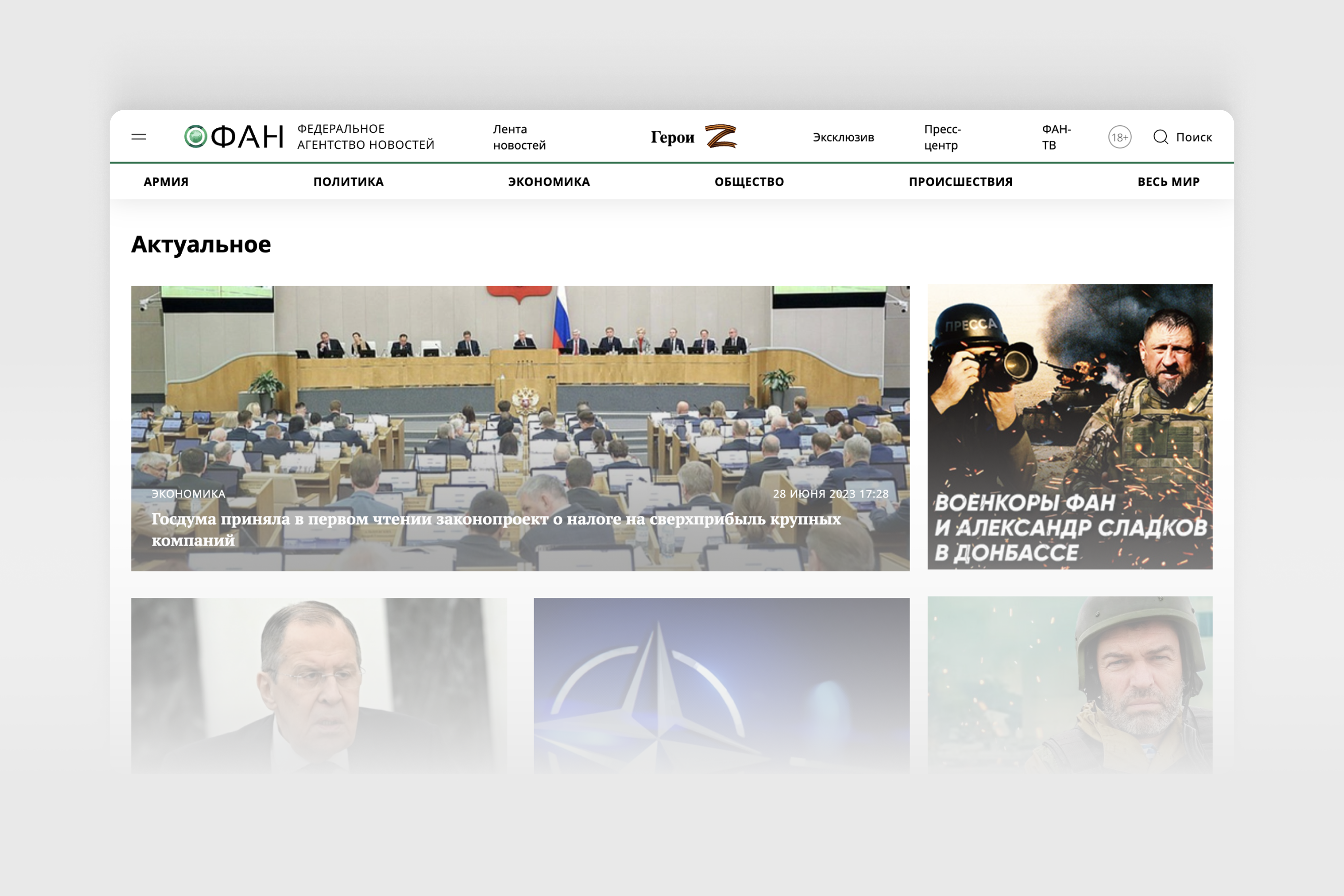 Новость о соглашении президента Беларуси Александра Лукашенко с Пригожиным, согласно которому ЧВК Вагнера должна вернуть наемников в полевые лагеря, РИА ФАН опубликовало уже со ссылкой на РИА Новости и пресс-службу Владимира Путина. А на следующий день на сайте издания вышла целая серия коротких сообщений, похожих скорее на пресс-релизы Минобороны, — например, о рабочем совещании главы ведомства Сергея Шойгу (которого до этого Пригожин обвинял в трусости и предательстве интересов России).