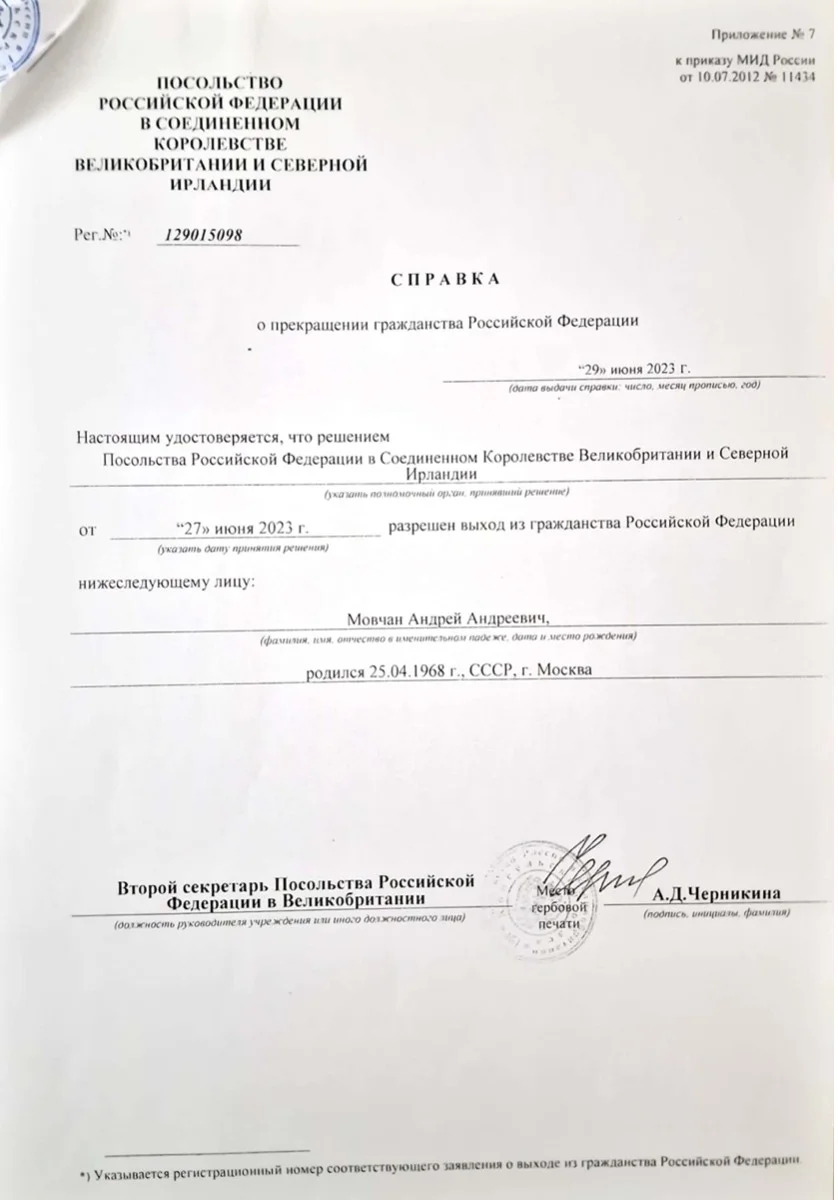 Мовчан объяснил свой отказ от гражданства тем, что он был «безразличен» для страны.