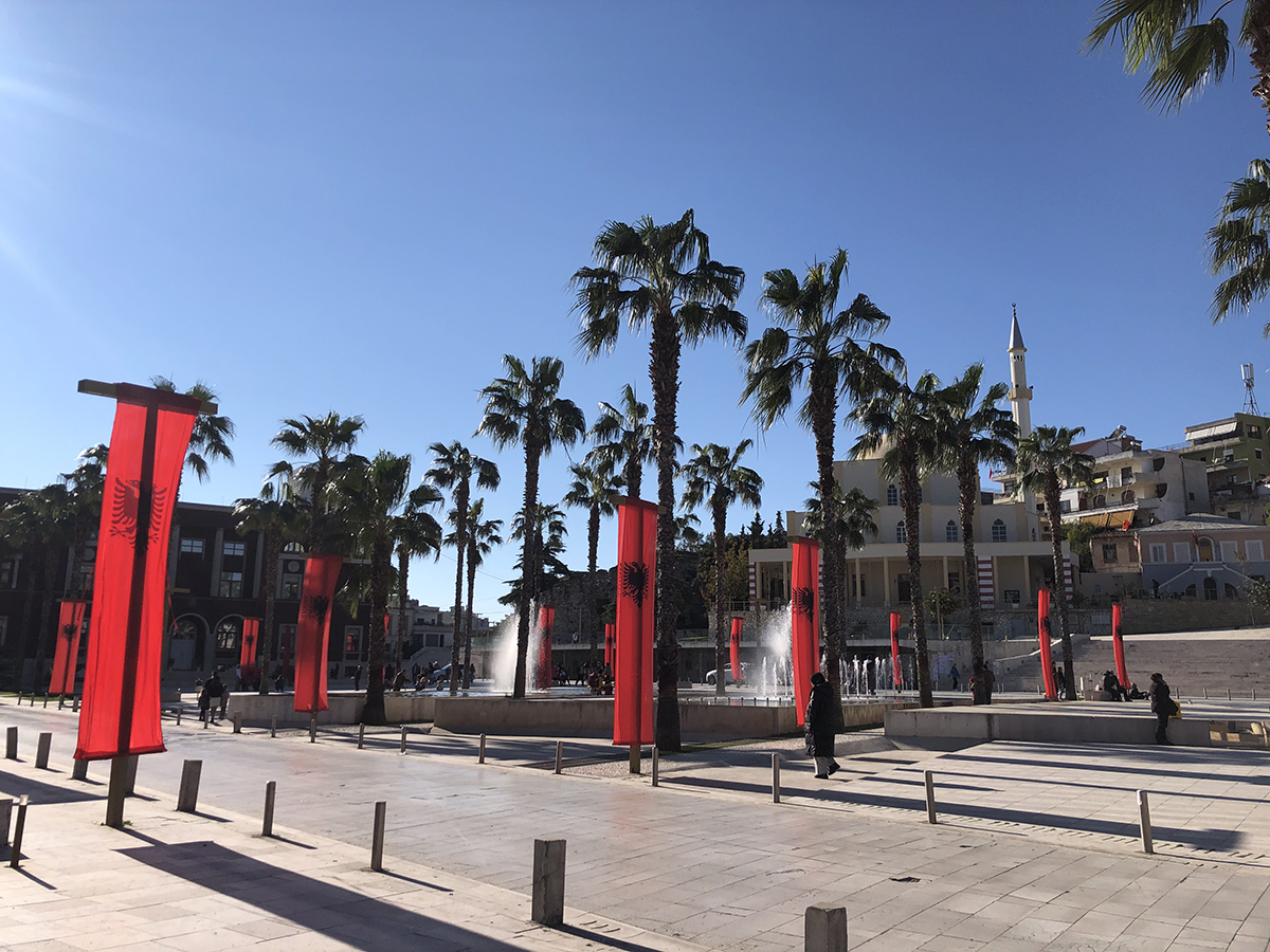 Мы знакомились с городом. На главной площади — Скандербег на коне, карусель, мечеть и кафедральный православный собор. Муэдзин поет, в колокольне бьют колокола, дедушки в плащах и шляпах играют в шахматы. Старые пятиэтажки, «ходжовки» и новостройки в длинношеих кранах. Козы, провожающие взглядами бегунов на дорожке вокруг озера. Модный район Блоку с переполненными кафе. Регулировщики движения, свистящие так, что закладывает уши. Бабушки, продающие семечки в газетных кульках. Красные флаги с черным орлом и прохожие в черно-красных спортивных костюмах под черно-красными зонтами. Облетающие платаны, бункеры, расписанные граффити, и рождественские гирлянды.