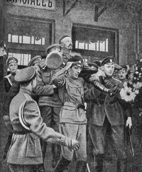 «…Во время погрузки на ст. Дно подполковник кн. Дадиани вел агитацию против министра-председателя в том смысле, что Керенский морфинист, кокаинист, женат на немке, не пользуется доверием большинства населения и потому не может управлять страной…»