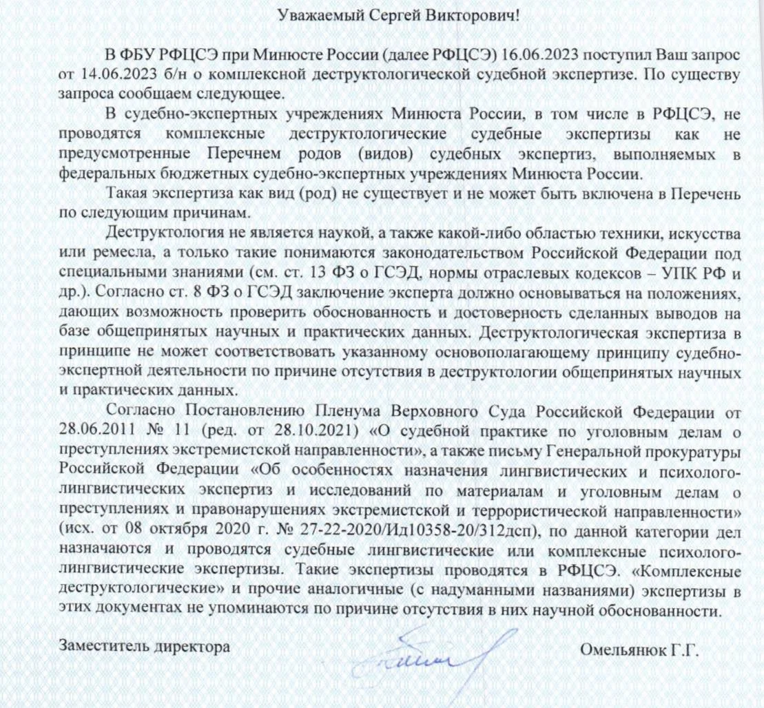 Из ответа центра следует, что такая экспертиза не может служить доказательством в суде, так как «деструктология не является наукой».