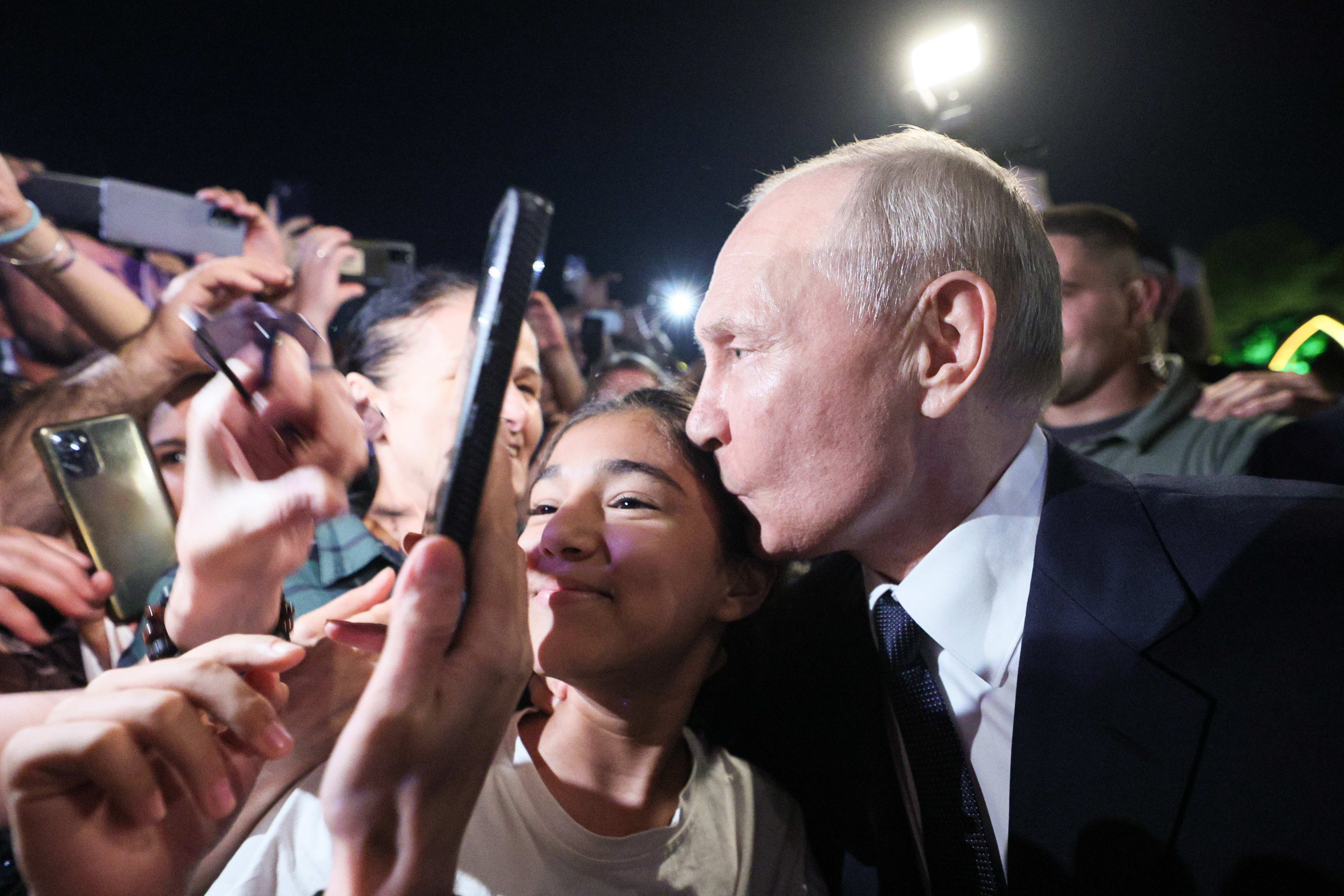 только что своими глазами смотрела видео, где президент россии стоит в центре возбужденной людской толпы, буквально систнутый ею, все его трогают руками, а он в ответ всех целует ртом.