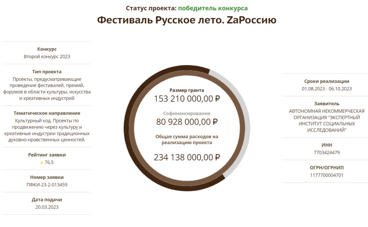 - Согласно проекту, фестиваль «Русское лето. ZaРоссию» стоимостью 153 млн рублей должен охватить 26 городов России, а также «новые регионы». Программа фестиваля посвящена «СВО». Автор проекта — «Экспертный институт социальных исследований», в СМИ его называют структурой из политологов и пиарщиков, работающей на администрацию президента России.