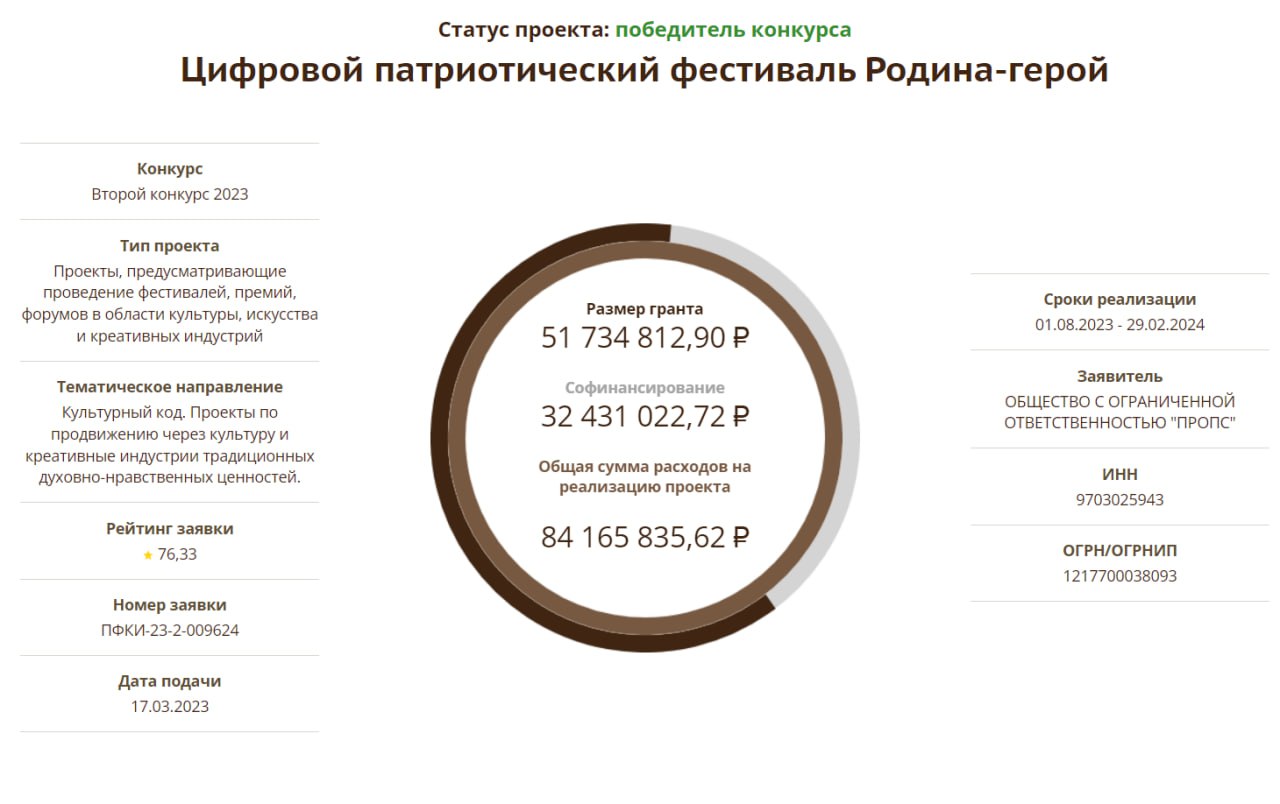 - По задумке авторов проекта, в этом году фестиваль должен включить кинофестиваль «Кино на службе Отечества» и выступления спортивного движения «Сильнейшая нация мира». Входят ли эти проекты в стоимость гранта – неизвестно, но президентские гранты отдельно одобрены и на них. Кинофестиваль обойдется в 18,5 миллиона рублей, спортивное выступление – 5,5 миллиона.