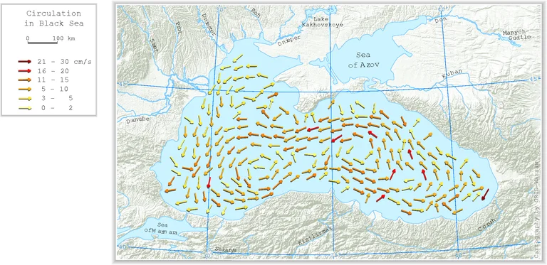 Направление течения потока воды в Черном море формируют крупные реки — Дунай, Днепр, Днестр, а также Керченский пролив. Кроме того, на течение влияет направление ветра и морфология линии побережья. Однако доминирующее направление — по правой стороне. То есть сразу после Херсона вода идет мимо Одессы, затем следует в сторону Румынии, затем — болгарской Варны, Турции — Босфора и Анатолийской низменности, затем с северо-запада эти течения заходят в Грузию, а потом течение разделяется надвое, и цикл завершается снова в Украине — в районе Крыма.