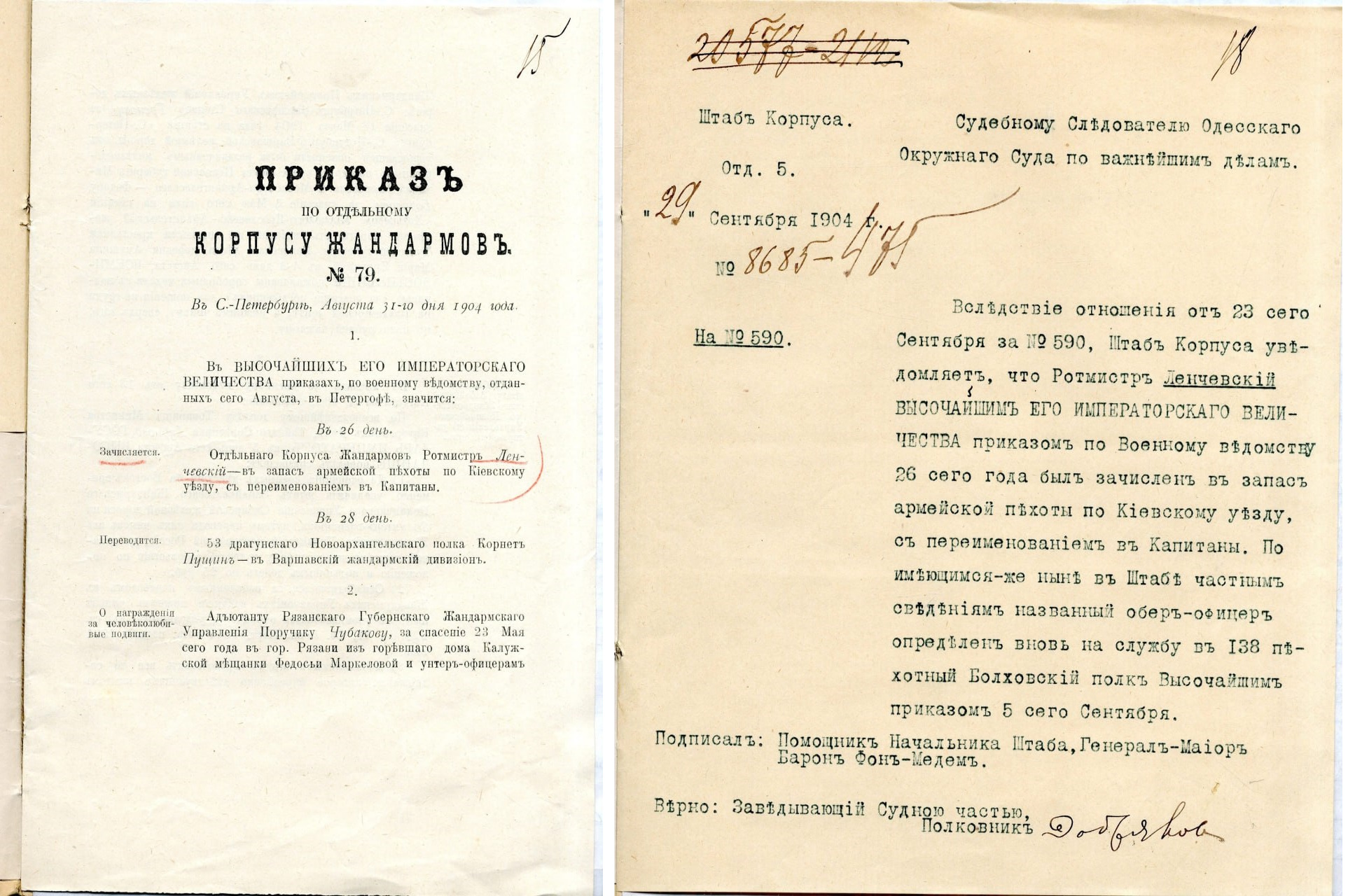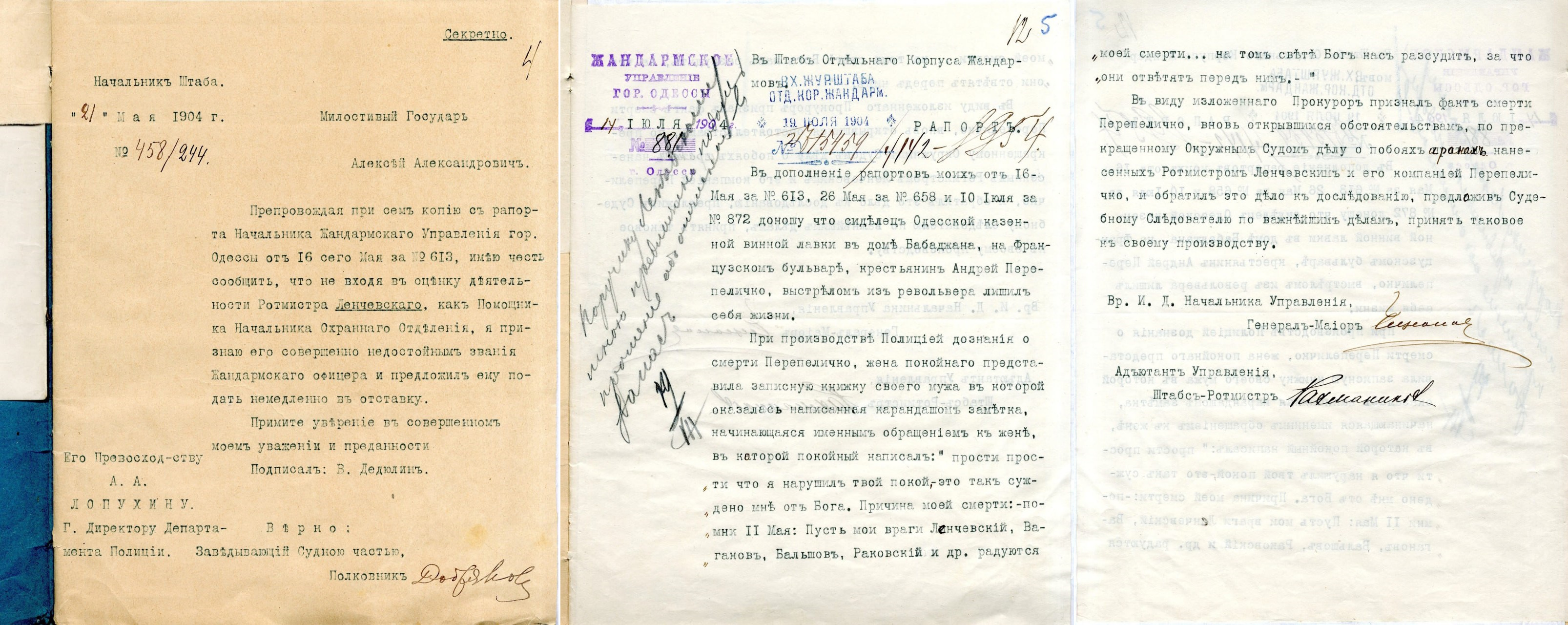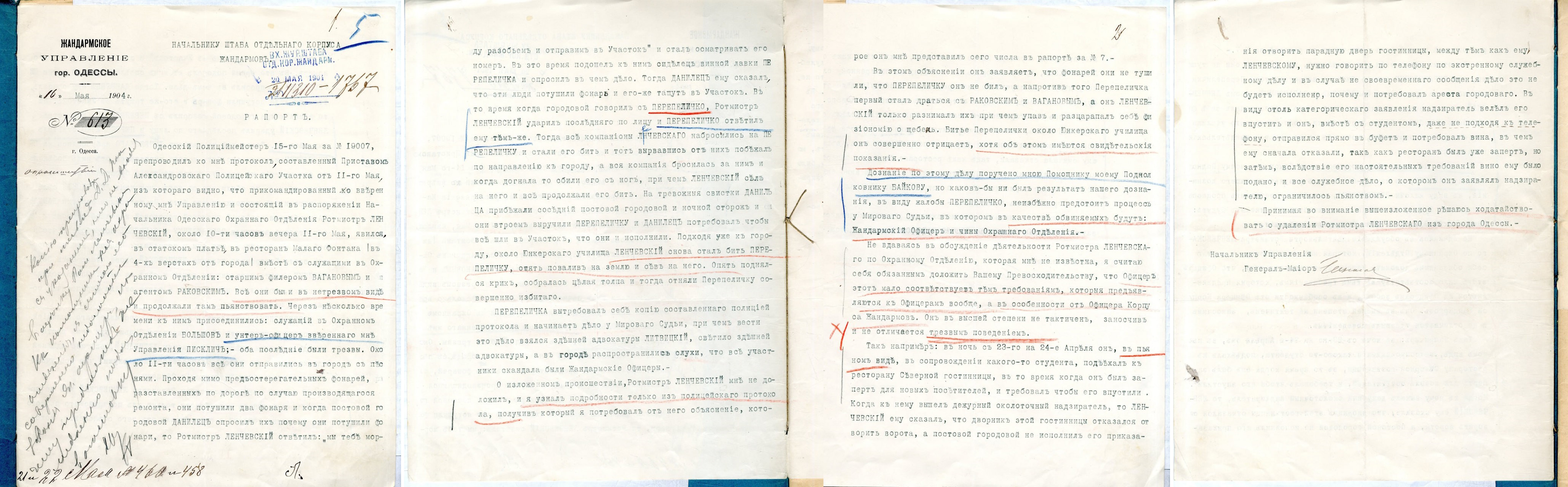 ГА РФ. Ф. 110. Оп. 6. Д. 1119. Л. 1–2 об., 4., 12, 12 об., 15, 18 (нажмите на изображение, чтобы приблизить) 16 мая 1904 года начальник жандармского управления города Одессы сообщал в Петербург начальнику штаба Отдельного корпуса жандармов, то есть главе силового подразделения политической полиции Российской империи, о неприятном происшествии с одним из его подчиненных.