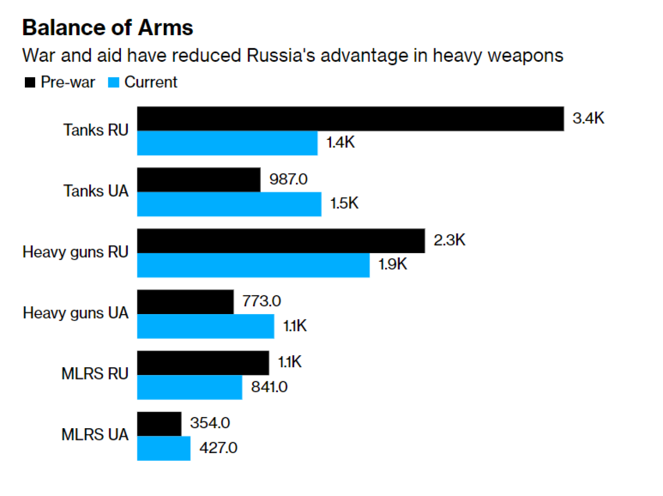 По другим видам тяжелых вооружений разрыв тоже сократился. Если в начале войны у России было втрое больше реактивных систем залпового огня (РСЗО), то теперь – вдвое; аналогичная ситуация с тяжелой артиллерией (152- и 155-миллимитровые гаубицы). Во всех случаях количество вооружений у России уменьшилось, а у Украины – увеличилось.