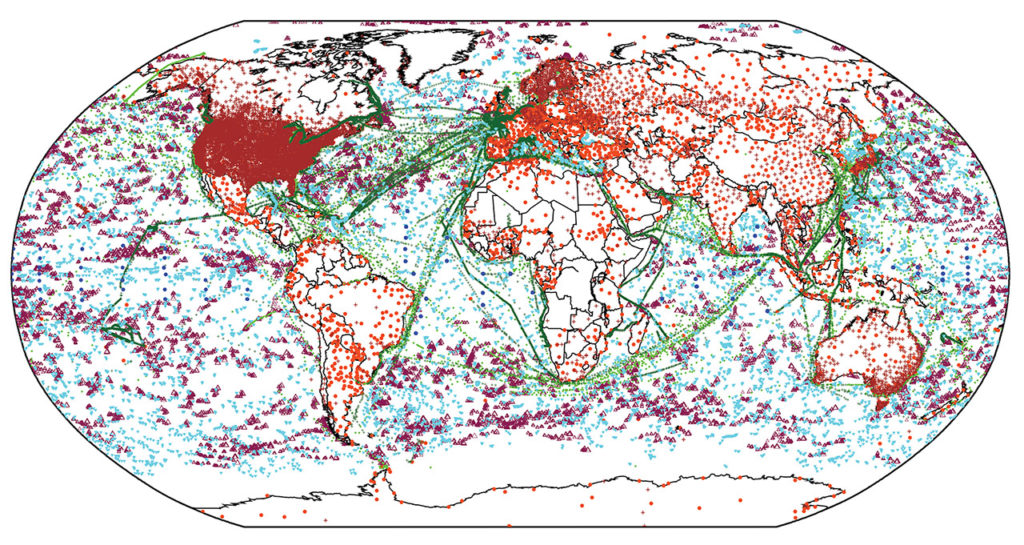 Сейчас климатологи используют данные десятков тысяч наземных метеостанций (здесь вы можете посмотреть исторические данные с них). Например, в последней версии датасета NOAAGlobalTemp, созданного американским метеорологическим ведомством NOAA, — информация с 26 тысяч метеостанций на суше. Но этого мало: сюда же входят данные с кораблей, со множества измерительных буев; наконец, данные о температуре поверхности получают со спутников, например с радиометров MODIS на американских спутниках Terra и Aqua (больше известных данными о пожарах).