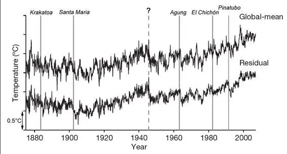 Климатологи обработали таким образом данные о температуре с 1880 по 2000 год и увидели, что после вычета естественных факторов температура постоянно росла, но не непрерывно: в некоторые годы график резко падал (а потом продолжал рост). Для всех таких падений быстро нашлось объяснение: они были связаны с извержениями вулканов, в частности с извержением вулкана Пинатубо в июне 1991 года. Во время извержений в верхних слоях атмосферы оказывается огромное количество вулканического пепла, который задерживает солнечное излучение и охлаждает поверхность планеты.