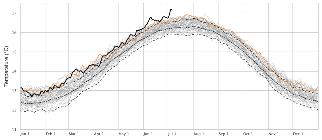 В качестве базового значения — среднего, от которого отсчитываются отклонения — используются усредненные измерения за период с 1979 по 2000 год. От этого среднего рекордное значение 4 июля (17,18 градуса Цельсия) отличается на 0,98 градуса. Прежний рекорд был поставлен 13 августа 2016 года (16,92 градуса) и повторен 24 июля 2022 года.