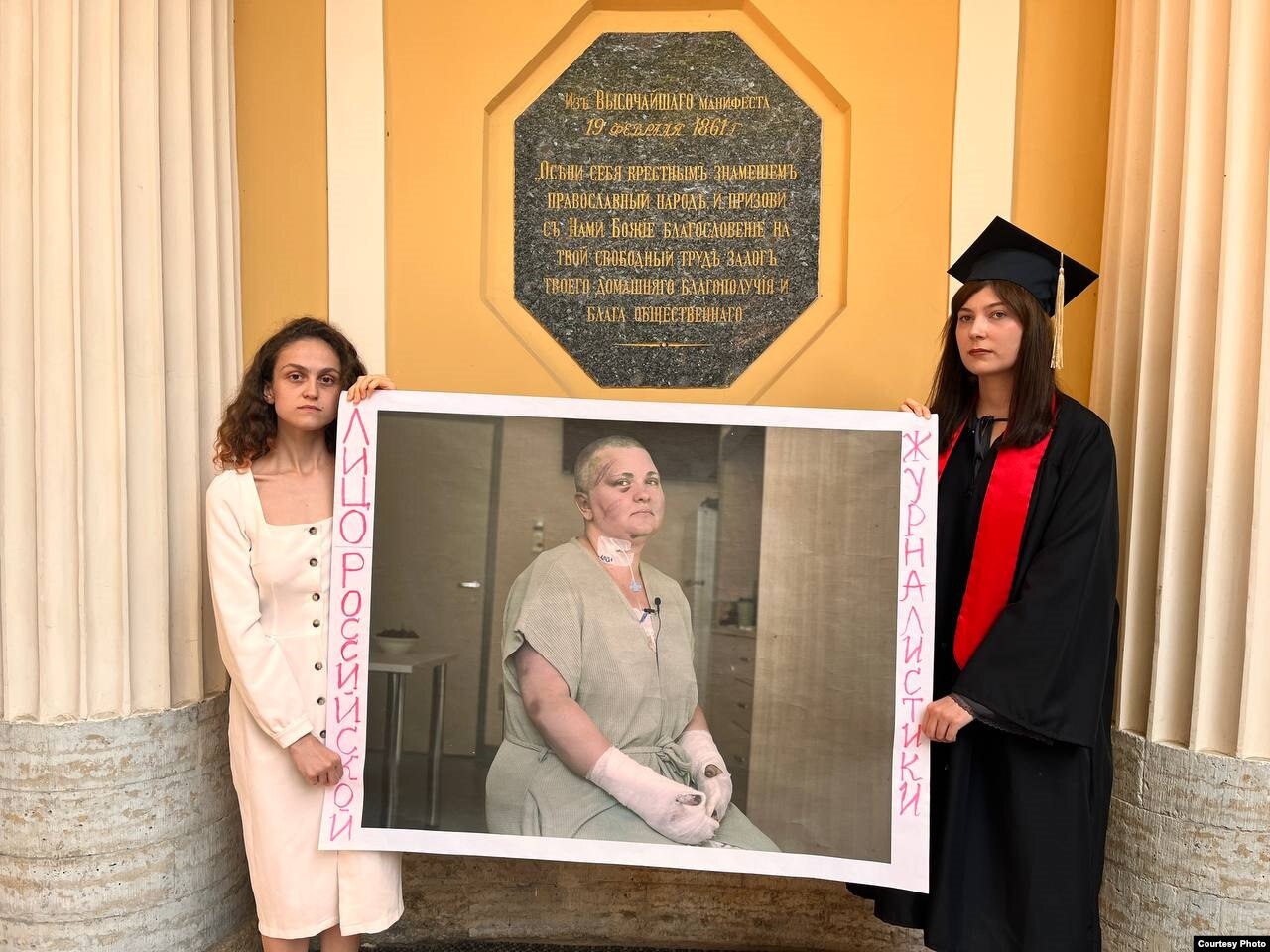 Выпускницы журфака Санкт-Петербургского государственного университета провели акцию в поддержку избитой в Чечне журналистки Елены Милашиной. Они развернули у входа в вуз плакат с надписью "лицо российской журналистики" и фотографией пострадавшей Милашиной. В разговоре с Север.Реалии студентки заявили, что таким образом хотели поддержать ее "от лица неравнодушных выпускников".