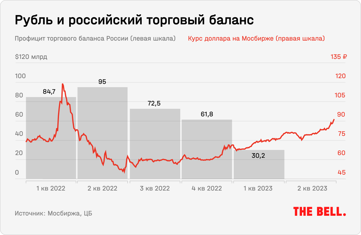 Последнее — особенно важно. Ведь в предыдущие годы при сильной девальвации рубля на рынок приходили нерезиденты, стремящиеся заработать на разнице ставок и курсов. Теперь их нет и не будет. В результате курс рубля теперь намного больше, чем раньше, зависит от торгового баланса. Именно его первый зампред ЦБ Ксения Юдаева назвала основным фактором нынешнего падения: «Мы видим существенное сокращение текущего сальдо в этом году по сравнению с прошлым годом и с последним кварталом, это связано и со снижением экспортной выручки, и, по-моему, снижение цен сказалось».