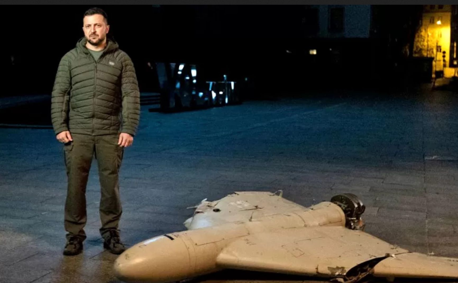 Зеленский на фотографии, опубликованной Би-Би-Си, стоит рядом со сбитым Shahed 131.