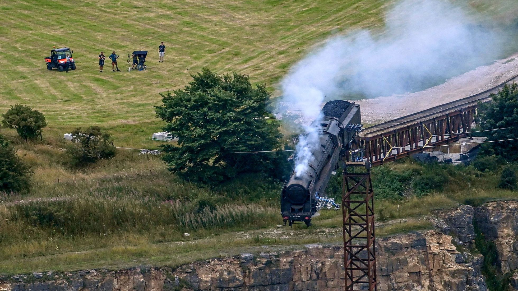 Маккуорри и Круз хотели пустить с обрыва настоящий поезд и снять сцену без использования графики. Но реальных составов, которые можно было бы разбить, по словам режиссера, «не нашлось». Поэтому команде пришлось построить поезд — точнее, несколько вагонов, которые действительно могли ехать по железнодорожным путям.