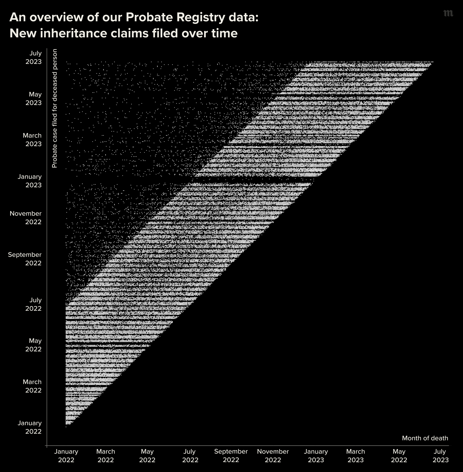 - Journalists at Meduza and Mediazona obtained access to a restricted but non-classified database of inheritance cases, and we compared trends in these data to those evident in both publicly available demographics and previous reporting on published obituaries. The records we received include more than 11 million individual cases since 2014, and each inheritance claim shows the deceased person’s full name, the dates of birth and death, the date when the probate case was opened, and other information. The records here are not comprehensive, but the large sample size makes the data representative, which is what matters for this analysis. The cases included in the database were opened between 2014 and May 2023.