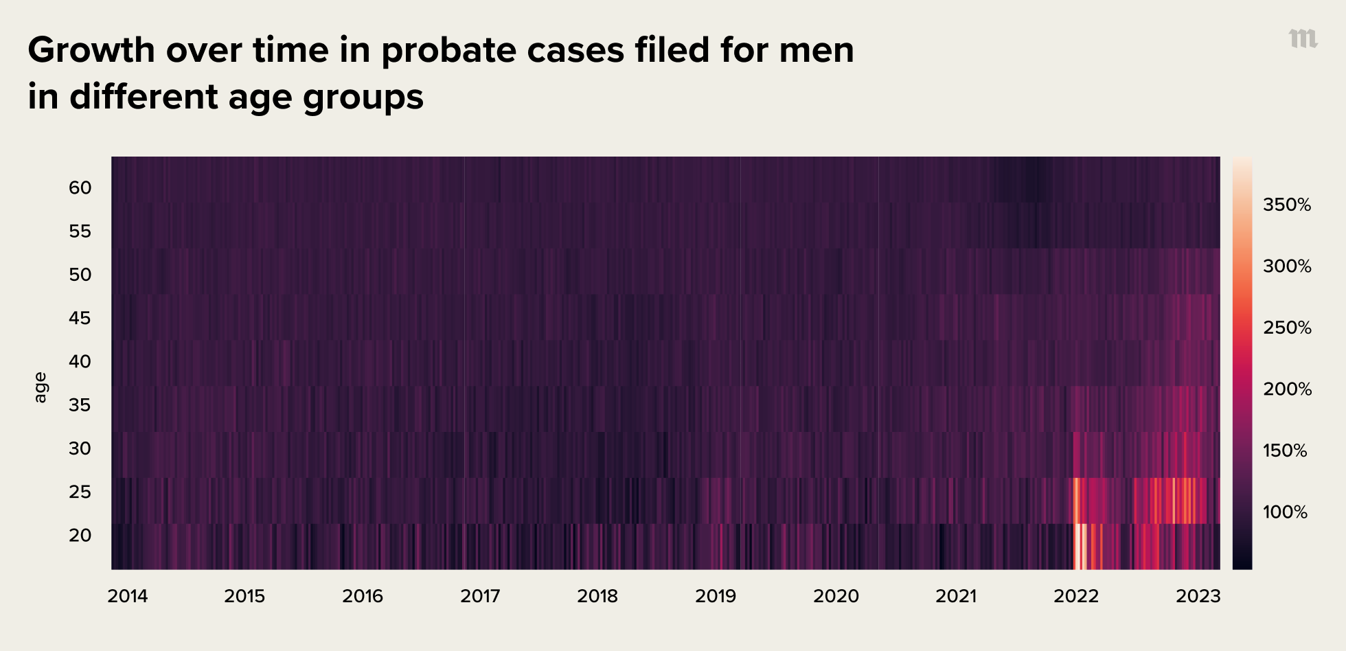 The number of new probate cases filed for men in various age groups (even older men) surged twice in our dataset, first in the fall of 2022 after Russia instituted a “partial mobilization” and then again after the armed forces accelerated the recruitment of prison inmates.
