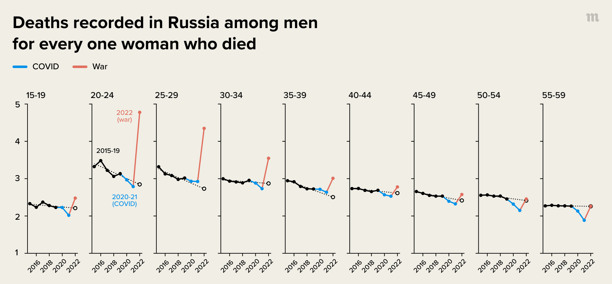 Independent of these calculations, we also requested information from Russia’s Federal State Statistics Service (Rosstat) on deaths between 2016 and 2022 among men, women, and various age groups. To navigate the impact of the coronavirus pandemic on mortality rates, we focused on the pre-war and post-war relationship between the number of deaths among men and women, knowing that soldiers dying in 2022 would raise mortality for men but not women. Before the pandemic, among Russians between the ages of 20 and 24, Rosstat data show roughly 3.2 men dying for every deceased woman. Because COVID-19 infected and killed men and women alike, the number of Russian men dying per woman was on track to fall to 2.8 in 2022. Instead, in what appears to be the obvious result of the war, the number of men dying per woman at these ages soared to 4.8.