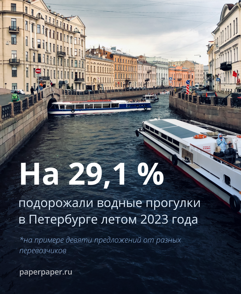 Подорожание водных прогулок в Петербурге значительно превысило официальную инфляцию: за весь 2022 год рассчитываемый Росстатом индекс потребительских цен вырос на 11,94 %. С сентября 2022-го по май 2023-го цены выросли на 2,96 %, следует из данных на сайте ведомства.