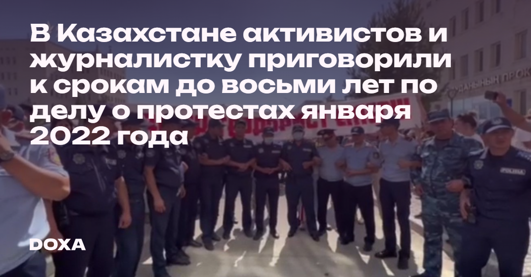 Суд в Алматы приговорил журналистку Айгерим Тлеужан к четырем годам лишения свободы и активистов Каласа Нурпеисова, Нурлана Далибаева, Ермухамета Шилибаева и Жан-Айдара Карменова к восьми годам лишения свободы. Их обвинили в захвате аэропорта в городе во время антиправительственных протестов в январе 2022 года.