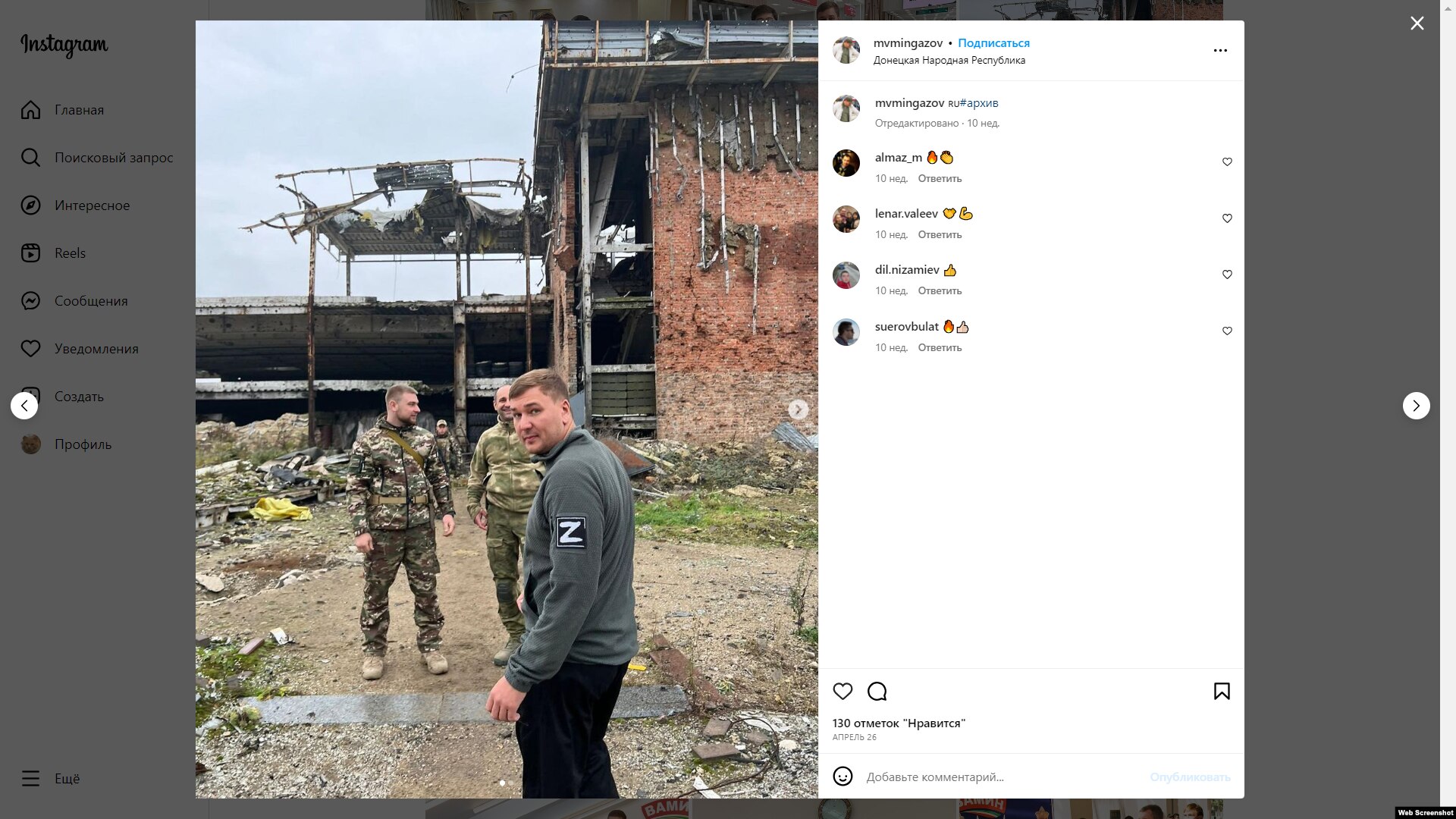 На фото, датированном 26 апреля, в той же соцсети Минтимер Мингазов демонстрирует рукав с нашитым на него шевроном "Z" на фоне разрушенного здания. На публикации стоит геотег "Донецкая Народная Республика".