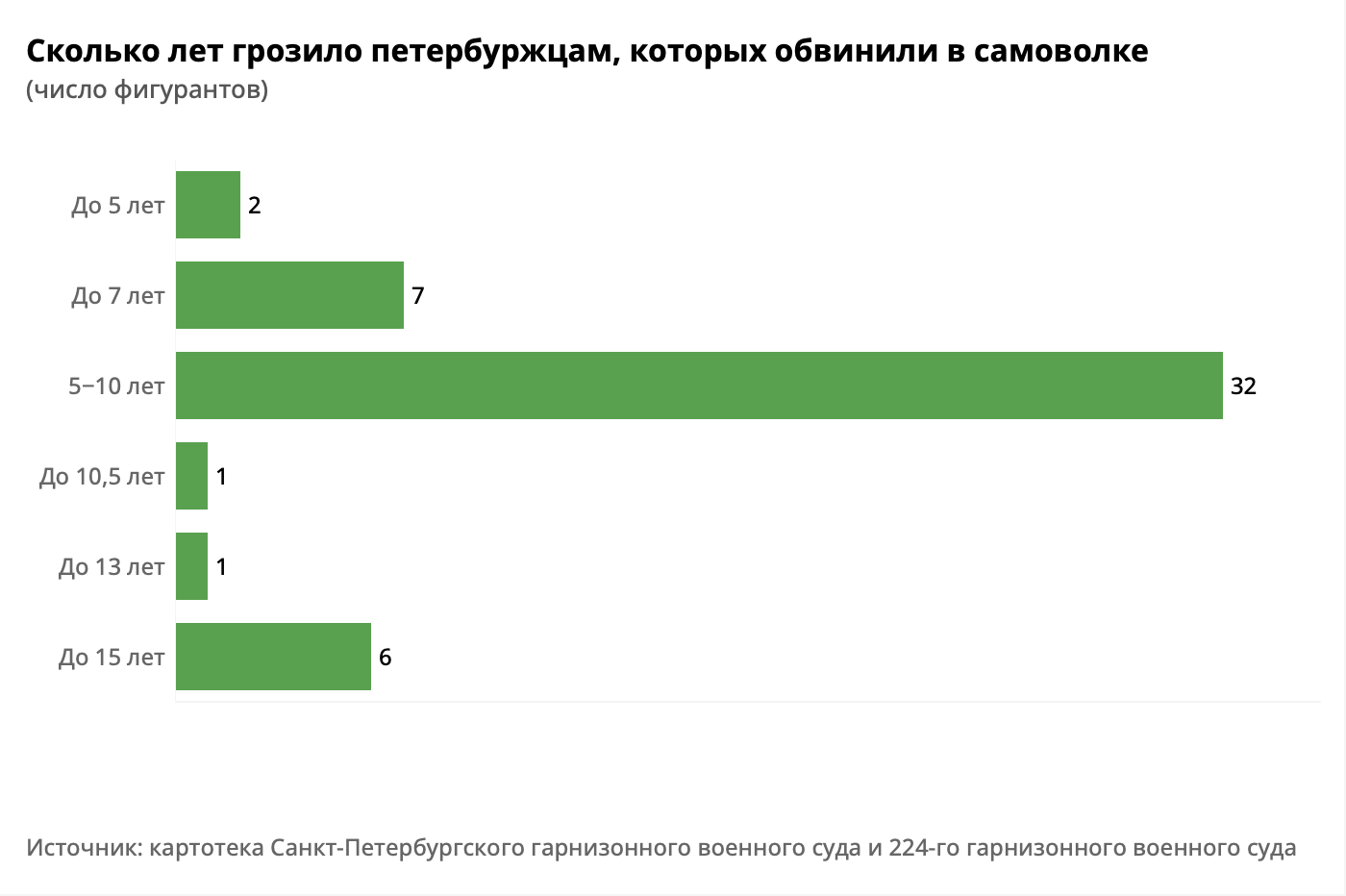 Приговоры. Тексты приговоров ни в одном из 49 случаев военные суды Петербурга не публиковали. Однако часть статистики приводила объединенная пресс-служба судов Петербурга — она рассказывала про 38 приговоров в период с 24 сентября по 15 июня.